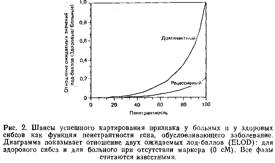 В случае болезни, наследуемой как доминантный признак с полной пенетрантностью, здоровые дети от брака с одним больным родителем так же информативны, как и больные дети: в обоих случаях мы точно знаем, какой аллель локуса, ответственного за заболевание, был унаследован каждым из них. Однако, когда пенетрантность неполная, генотип здорового потомка от больного родителя всегда неоднозначен. Неудивительно, что и анализ наследуемых ими маркеров мало что может дать в этом отношении, поскольку мы не знаем точно, унаследовали они мутантный аллель или нет. Рис. 2 показывает, как быстро уменьшается величина суммарного лод-балла с уменьшением степени пенетрантности.