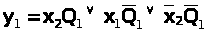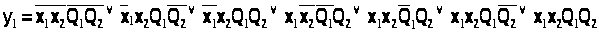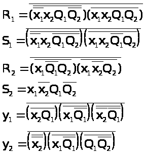 5. По таблицам выходов составляем уравнения логических функций для выходных сигналов y>1> и y>2>, учитывая, что в каждой клетке левый бит – y>1>, а правый бит – y>2>.