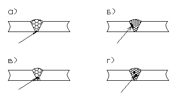 Неправильное положение электрода и направление дуги.