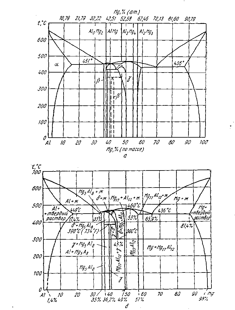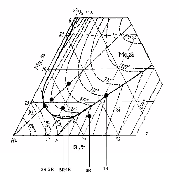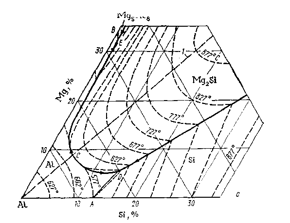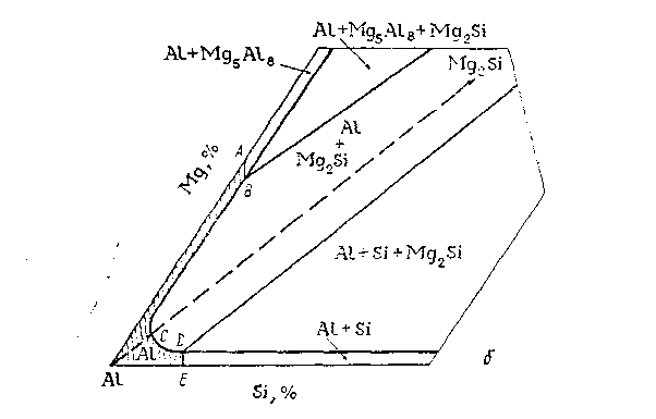 Основная упрочняющая фаза тройных сплавов — фаза Mg>2>Si, принадлежащая к дальтонидному типу с определенными химическим составом, свойствами и нормальной валентностью. Эта фаза имеет кубическую элементарную ячейку и не образует твердых растворов со своими компонентами, что характерно для ионных соединений в отличие от фаз бертоллидного типа (например, фазы Al>3>Mg.>:>).