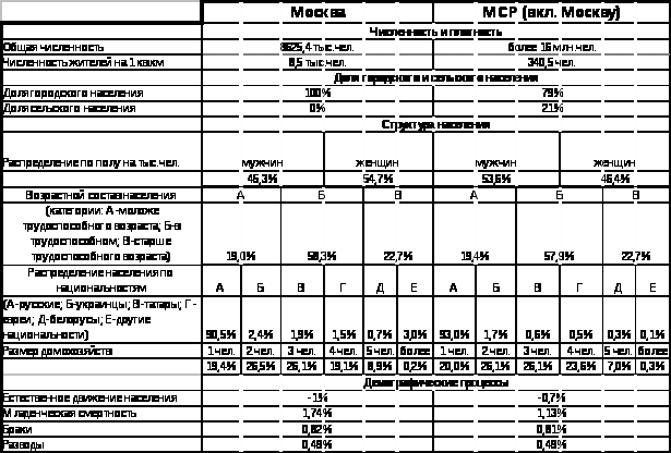 Классификация районов Москвы и Московского столичного региона (в дальнейшем - МСР) в целом происходит по основным демографическим показателям: общий коэффициент рождаемости и смертности; коэффициент естественного прироста; доля трудоспособного населения; доля детей; доля населения пожилого возраста в возрастной структуре населения; и, как вывод на основе нескольких переписей населения за различные годы, тенденции демографических процессов. Более общие сведения о населении МСР включают: численность и плотность; распределение по полу; по возрастному составу; распределение населения по отдельным национальностям; естественное движение населения. Эта статистика также включает распределение населения по источникам средств существования, размеру домохозяйств, миграции населения и другие аспекты.