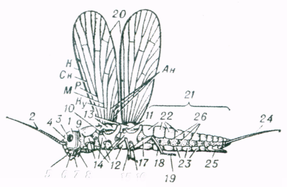 Рис. Схематическое изображение внешнего строения одного из видов двукрылых насекомых: 1 — головная капсула; 2 — усики; 3 — сложные глаза; 4 — простые глаза; 5 — верхняя губа; 6 — жвалы; 7 — нижние челюсти; 8 — нижняя губа; 9 — передняя грудь; 10 — средняя грудь; 11 — задняя грудь; 12 — кутикул ярные щитки (стерниты) грудных сегментов; 13 — тергиты; 14 — плейриты; 15 — тазик; 16 — вертлуг; 17 — бедро; 18 — голень; 19 — лапка; 20 — крылья с системой жилок (К — костальная жилка, Ск — субкостальная, Р — радиальные, М — медиальные, Ку — кубитальные, ан — анальные жилки); 21 — брюшко; 22—23 — тергиты и стерннты брюшных сегментов; 24 — церкп; 25 — яйцеклад; 26 — стигмы
