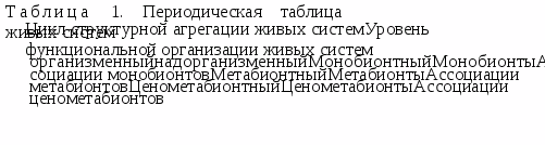 турная агрегация живых систем явилась стержнем их закономерного циклического развития и послужила основой периодических явлений в их эволюционном функционально-структурном усложнении. В схематической форме периодический характер эволюционного развития живых систем показан в виде периодической таблицы, которая объединяет все существующие варианты живых систем.