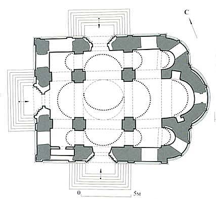 Той же идее подчинен и интерьер храма. Его пространство не загромождено хорами. Оно логисно нарастает от более низких углов к ступенчато повышенным средним сводам, а от них к еще более повышенным подкупольным аркам и, наконец, устремляется в подкупольный световой барабан. Широко расставленные подкупольные столбы (они соответствуют наружным лопаткам) не мешают воспринимать это пространство целиком, где бы мы ни встали. Оно равномерно освещено, так как окна размещены в трех регистрах: в стенах основного четверика, в центральных закомарах и в барабане. Все это сообщает интерьеру дух рациональной организованности и ясности, а если учесть отсутствие княжеских хоров, то и "демократичности".