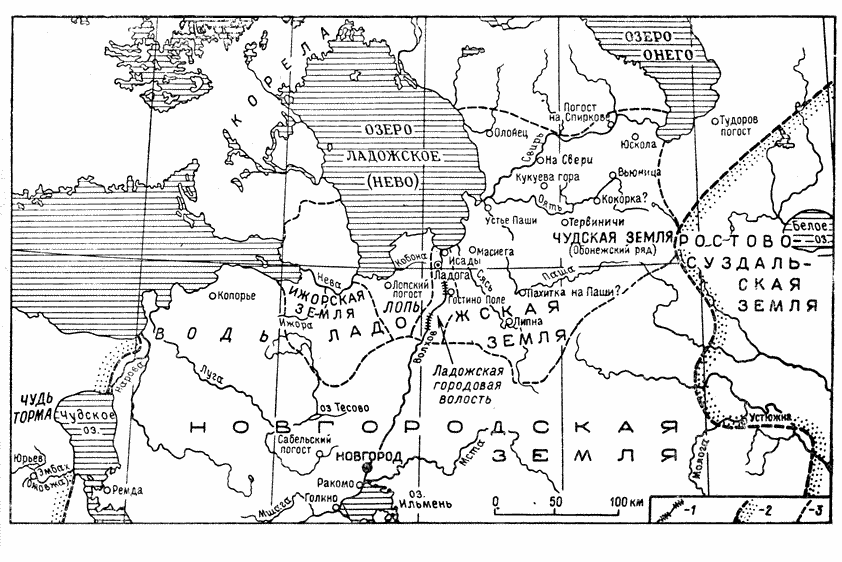 1 — пороги на Волхов; 2 — границы Новгородской и Ростово-Суздальской земель; 3 — границы Ладожской земели с ее подразделениями
