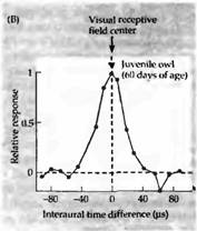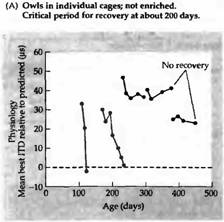 На более поздних этапах эксперимента призмы удаляли с глаз совы. Теперь вновь возникал дисбаланс между зрительной и слуховой картами. В том случае, если совы были моложе 200 дней в тот момент, когда удаляли призмы, слуховая карта во второй раз смещалась, возвращаясь к своему исходному положению, которое соответствует зрительной карте (рис.5., также см. рис. 6А).