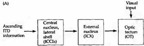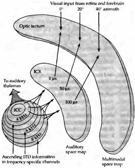 Другой возможностью для совы определить положение и траекторию движения мыши является зрение. На рис. 4А показано, что у нормальной взрослой совы нейронные карты пространства для зрения и слуха (neural maps for visual and auditory space) согласованы в одном слое зрительной области четверохолмия (tectum), которая соответствует зоне верхнего двухолмия у млекопитающих. Подобное картирование осуществляется при помощи измерения ответов отдельных нейронов четверохолмия на звуки, идущие от различных участков, и световые стимулы, предъявляемые в различных участках зрительного поля.