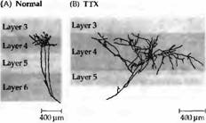 Рис. 1. Увеличение ветвистости волокон ЛКТ заканчивающихся в слое 4 зрительной коры, после аппликации тетродотоксина в оба глаза. (А) Нормальная ветвистость помеченных аксонов из ЛКТ в слое 4 (в возрасте 30 дней). (В)