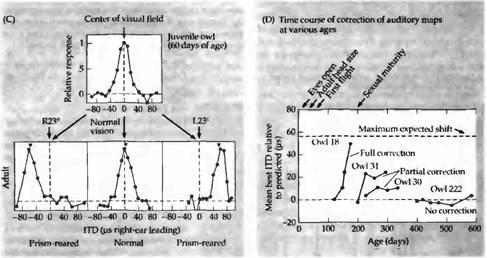 В серии экспериментов совят выращивали со смещенными на 23 градуса вправо или влево зрительными полями, для чего на глаза им помешались специальные призмы (рис. 5.А). Это сдвигало изображение зрительного поля на сетчатке и, следовательно, его проекцию в четверохолмии таким образом, что уже не было согласования между зрительной и слуховой картами (рис. 5.В, С). На протяжении следующих 6-8 недель происходило смещение слуховой пространственной карты, и она снова соответствовала зрительной карте. Пластичность в критический период, таким образом, позволяла проводить «тонкую настройку» функций коры в результате приобретаемого совой опыта и знаний об окружающем мире. В результате этого сова начала ориентировать свои глаза по направлению к источнику звука несмотря на искажающие призмы.