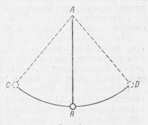 Но стоит лишь отвести шарик из положения равновесия (точка В) в точку С и затем отпустить его, как равновесие нарушится и маятник начнет совершать колебательные движения. С возрастающей скоростью шарик устремится по дуге СВ, по инерции пройдет точку В и, замедляя движение, дойдет до точки Д. Остановившись на мгновение, шарик начнет обратное движение под влиянием той же силы притяжения, пройдет по инерции точку В и достигнет точки С. Совершилось полное колебательное движение.