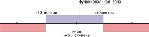 Но музыкальный строй формирует также функциональную зону ступени (интервала) – зона в которую входят звуки (звуковые интервалы), чьи функции берет на себя ступень (интервал). Границы функциональной зоны определяются, как точки, делящие пополам интервалы между соседними ступенями. В 12-ступенном равномерно-темперированном строе функциональная зона ступени (интервала) равна 50 центам (см. рис. 3), и она существенно шире зоны интонирования.
