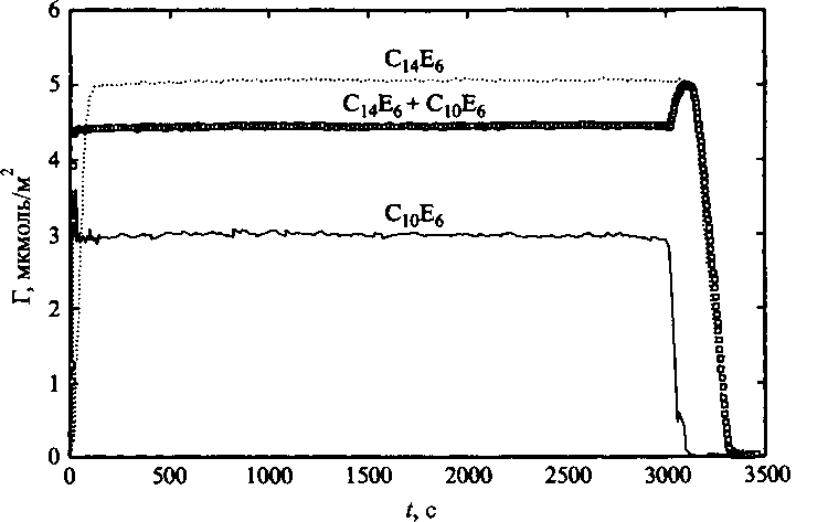 На рис. 19 приведен еще один пример одновременной адсорбции неионных поверхностно-активных веществ из смешанного раствора. На поверхности кремнезема измерена адсорбция С^Еб и СюЕб при молярном соотношении, равном 0.5, и суммарной концентрации НПАВ 2 мМ, что намного превышает KKM смеси. Адсорбция этих НПАВ из индивидуальных растворов составляет - 3 ммоль/м2 для СюЕб и ~5ммоль/м2 для С^Еб. Величина адсорбции из смеси составляет 4.5 ммоль/м, что указывает на то, что в поверхностном слое в избытке присутствует СнЕб за счет уменьшения доли СюЕб. Еще интереснее ведут себя подобные системы при разбавлении.