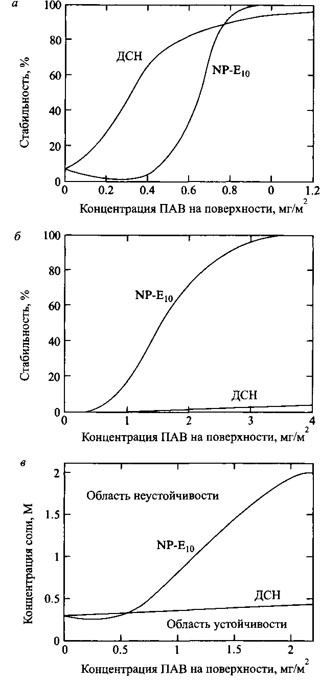 Из рисунков видно, что ДСН обеспечивает хорошую устойчивость к механическому воздействию, но его адсорбция на частицах латекса не приводит к стабилизации по отношению к действию электролита и циклам замораживание - оттаивание. В то же время адсорбция неионного ПАВ на поверхности частиц латекса обеспечивает высокую устойчивость латекса по отношению ко всем трем типам воздействия. Например, механическая устойчивость достигается при поверхностной концентрации выше - 0.6-0.8 мг/м2. Это значение соответствует монослою НПАВ, в котором молекулы лежат плоско на поверхности. При повышении поверхностной концентрации полиоксиэтиленовые цепи начинают выходить в водный раствор, что обеспечивает повышение устойчивости к коагуляции, вызываемой механическим перемешиванием. Устойчивость к циклам замораживание-размораживание достигается лишь при поверхностной концентрации выше ~2-2.5 мг/м2, что соответствует полностью заполненному монослою НПАВ, в котором молекулы ПАВ образуют "частокол", т.е. их углеводородные цепи контактируют с поверхностью, а полиоксиэтиленовые цепи направлены в раствор.