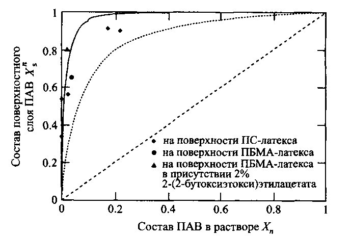 Рис.18. Состав поверхностного слоя на латексных частицах в зависимости от состава смешанного раствора ПАВ, содержащего NP-Ejо и ДСН. Адсорбция на полистирольном и полибутилметакрилатном латексах. Штриховая прямая отвечает равному распределению между поверхностью и раствором; пунктирная линия - распределение, рассчитанное в предположении отсутствия взаимодействия между поверхностно-активными веществами). Сплошная линия - расчет с учетом взаимодействия между ПАВ