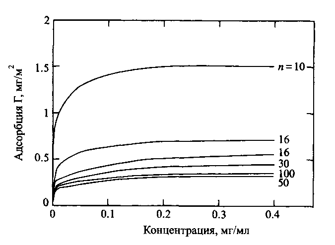 Поверхностное агрегирование по природе аналогично мицеллообразованию, поэтому адсорбция также сильно зависит от длины алкильной цепи. Поверхностно-активное вещество с наибольшей длиной гидрофобной цепи адсорбируется в наибольшей степени. Из рис.9 видно, что адсорбция является кооперативным процессом, поскольку она резко возрастает в узком интервале концентраций. И наиболее значителен этот эффект для ПАВ с длинными "хвостами". Эти данные служат дополнительным доказательством сильной зависимости адсорбции от структуры молекул ПАВ и более слабой зависимости от взаимодействий молекул ПАВ с поверхностью.