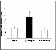 Рис. 2. Активность АПФ у онкологических больных при химиотерапевтическом воздействии (нмоль продукта, образовавшегося за 1 мин инкубации на 1 мг белка, Mm, n=1218; достоверность отличий: * - p< 0,05 относительно контроля; ++ - p< 0,01 относительно до химиотерапии).