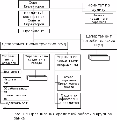 В крупном банке (рис. 1.5) происходит специализация и сегментация отдельных функций кредитования. При этом отраслевой принцип организации ссудных операций сочетается с географическим. Выделяются две крупные «ветви» кредитных операций. Одна группа отделов, осуществляет выдачу деловых кредитов. Старшие руководители банка возглавляют отделы по кредитованию предприятий различных отраслей, выдаче внешних кредитов, кредитованию клиентуры в городских районах и операции в провинции. Кроме того, есть большой отдел кредитных операций, выполняющий работу по анализу финансового положения клиентов, подготовке всей документации, оформлению ссуд и контролю за их погашением. Вторая «ветвь» организационной структуры контролирует операции по кредитованию потребителей и тесно связана с работой филиальной сети банка. На верхних этажах банковской администрации имеется кредитный комитет, рассматривающий дела о предоставлении крупных ссуд и утверждающий рядовые сделки, комитет по аудиту и подразделения , осуществляющие анализ кредитного портфеля. Стратегию кредитной политики определяет совет директоров банка.