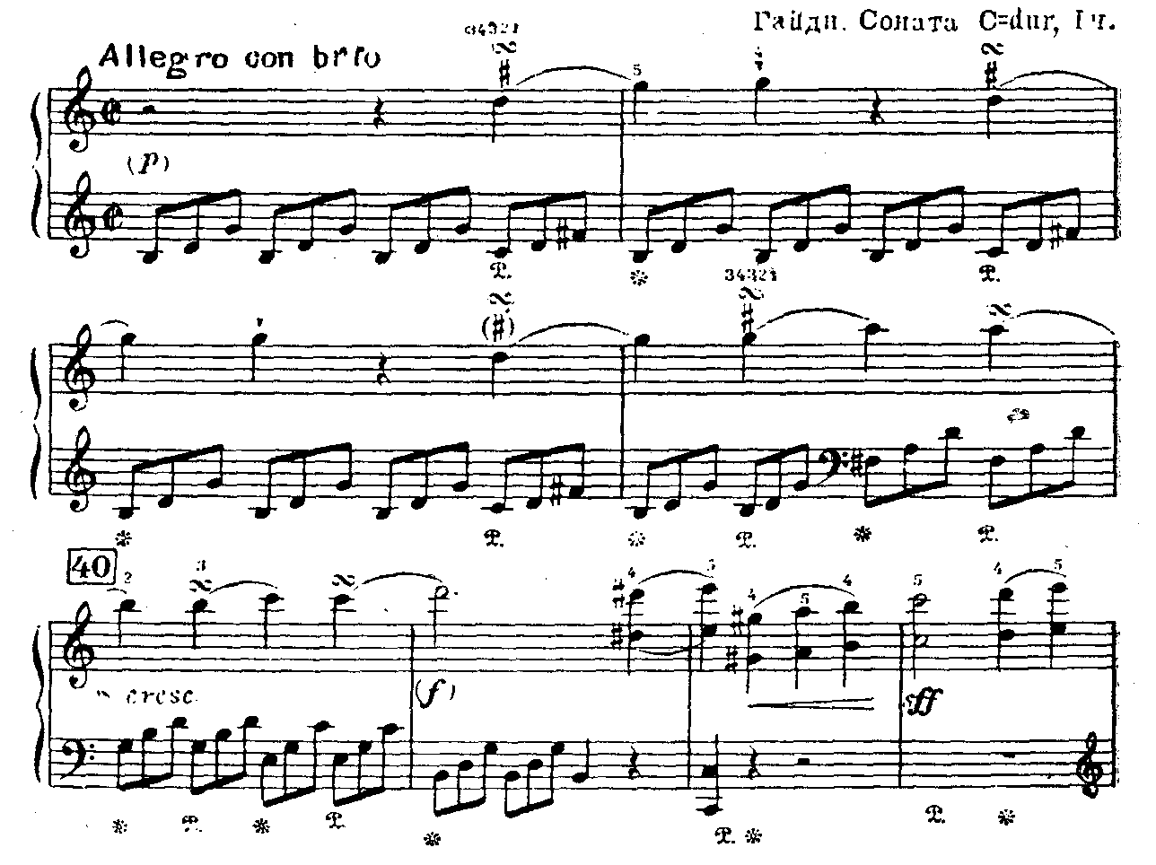 В самом начале работы над сонатой я указала на связь фортепианного изложения ранних венских классиков с квартетно- оркестровым письмом, а также сочла необходимым углубить представление студентки о метро- ритмических особенностях творчества Гайдна. Я рассказала о том, что в его произведениях метро- ритмическая организация в значительной мере придаёт музыке ясность, активный, жизнеутверждающий характер. Я обращаю внимание студентки на то, что при исполнении классических сонат надо всегда очень отчетливо ощущать сильные доли такта. Особенно важно это в затактных построениях и при синкопах, потому что без ощущения постоянных центров тяготения мотивов к сильной доле в этих случаях происходит как бы смещение тактовой черты и смысл музыки совершенно искажается. Далее мы говорим о ритмическом пульсе, скрепляющем воедино отдельные разделы произведения.