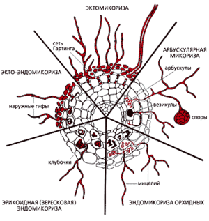 Различают Микориза эктотрофную (наружную), при которой гриб оплетает покровную ткань окончаний молодых корней и проникает в межклетники самых наружных слоев коры, и эндотрофную (внутреннюю), которая характеризуется внедрением мицелия (гиф гриба) внутрь клеток. Эктотрофная Микориза характерна для многих деревьев (дуб, ель, сосна, берёза), кустарников (ива), некоторых кустарничков (дриада) и травянистых растений (гречиха живородящая). Молодые корни этих растений обычно ветвятся, окончания их утолщаются, растущая часть корней окутывается толстым плотным грибным чехлом, от которого в почву и по межклетникам в корень на глубину одного или несколько слоев коры отходят гифы гриба, образуя т. н. сеть Гартига; корневые волоски при этом отмирают (эуэктотрофный тип Микориза). У кустарничка арктоуса арктического и травянистого растения грушанки крупноцветковой гифы гриба проникают не только в межклетники, но и в клетки коры (эктоэндотрофный тип Микориза). Эктотрофные Микориза образуют чаще гименомицеты (роды Boletus, Lactarius, Russula, Amanita и др.), реже - гастеромицеты. В образовании Микориза на корнях одного растения может участвовать не один, а несколько видов грибов. Однако, как правило, в растительных сообществах встречаются лишь определённые грибы-микоризообразователи - симбионты данных видов растений.