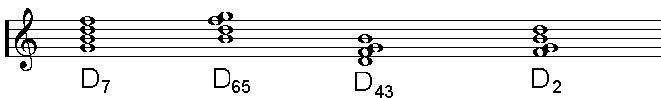 Обращение можно получить, перенеся нижний звук аккорда на октаву вверх. Собственно, необязательно на одну октаву. Главное, чтобы нижним звуком стал другой тон аккорда. Названия обращений септаккорда образуются от двух интервалов: между нижним звуком и примой аккорда, и между нижним звуком и септимой аккорда.