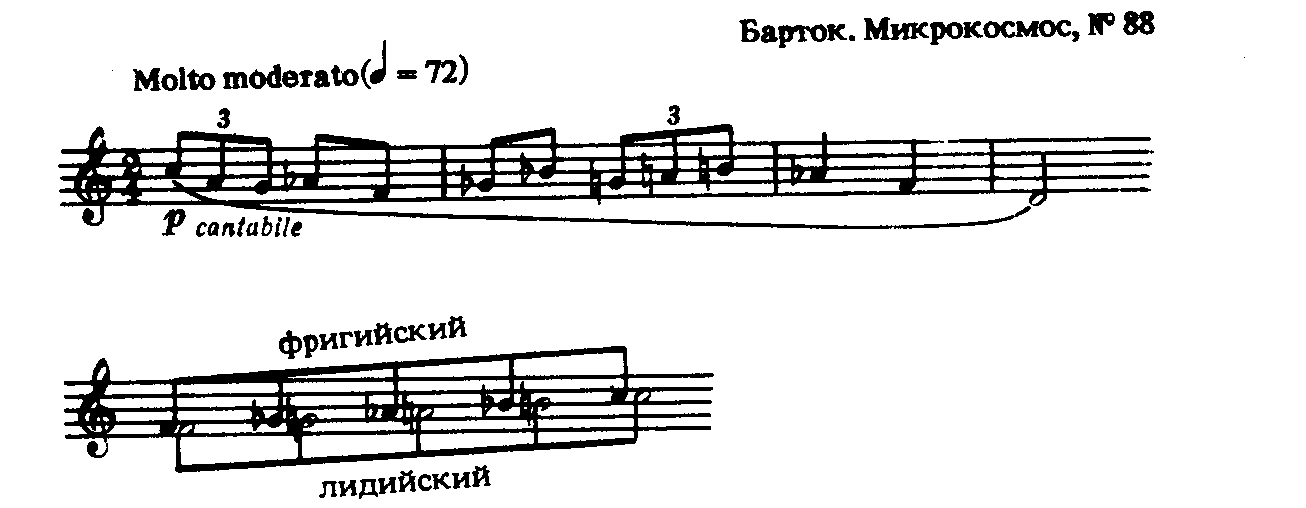 В музыке XX века не только увеличивается удельный вес диатонических ладов, но и обогащаются их виды и методы использования. Рассмотрим сказанное на примере музыки венгерского композитора XX века Бэллы Бартока.