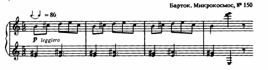 Пентатонические напевы Барток относит к древнейшему пласту венгерской народной музыки. Примером использования пентатоники является фортепианной миниатюры № 107 из цикла "Микрокосмос". (см. Приложение №5)