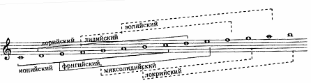 Среди многообразия монодических ладов можно выделить лишь несколько разновидностей, которые закрепились как относительно постоянные структуры. Наиболее отстоявшейся в этом ряду является группа семиступенных ладов, сложившихся в практике полифонического многоголосия. Каждый их этих ладов имеет строго фиксированную интервальную структуру звукоряда. Все разновидности этих тонов можно построить на звукоряде "белых клавишей", лишь перемещая тонику.