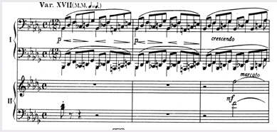 При варьировании возникают такие варианты темы, которые сами становятся темами для будущего варьирования, например XIV и XV вариации, XVIII – лирическая кульминация всего цикла – является вариацией на XIV и, одновременно, явно производна от главной темы (обращение). Тема Паганини очень быстро становится темой Рахманинова, то есть, поглощается, ассимилируется авторским стилем. Даже "скрипичные" приемы игры на фортепиано не обманут слушателя – гармония и фактура в целом остаются рахманиновские (пример 1).