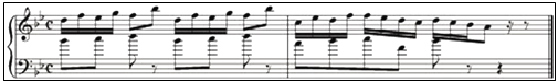 Побочная партия ритмически близка Главной и Связующей. Она в B-dur состоит из двух одинаковых предложений в верхнем и среднем регистрах.