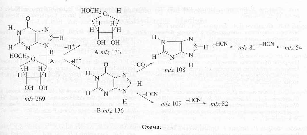 Уровень дейтерированности инозина исследовали методом масс-спектрометрии FAB из за высокой чувствительности, позволяющей детектировать 10-8-10-10 моль вещества в пробе, что существенно выше чем при использовании 1Н ЯМР-спектроскопии [7]. Пути фрагментации молекулы методом FAB приводят к распаду инозина на фрагмент рибозы А с Мr при массовом соотношении m/z 133 и гипоксантиновый фрагмент Б c Мr m/z 136 (их распад сопровождался миграцией протона Н+), который в свою очередь расщепляется на ряд менее низкомолекулярных осколочных фрагментов В, Г, Д, Е и Ж при m/z 109, 108, 82, 81 и 54 за счет элиминирования НСN и СО из гипоксантина (схема).