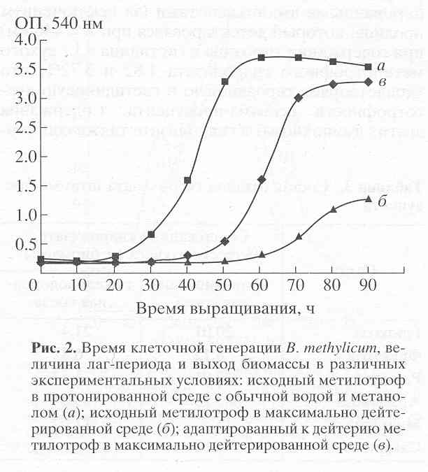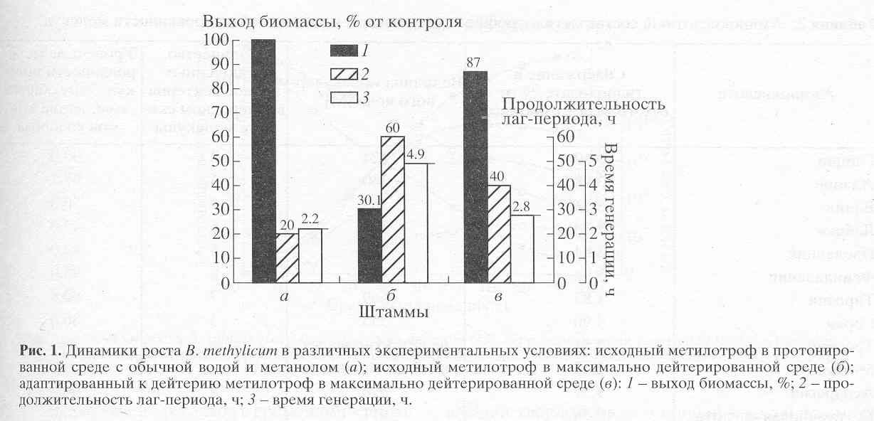 Выход микробной биомассы у адаптированного штамма (в) уменьшался на 13% по сравнению с контрольными условиями (рис. 2, а) при увеличении времени генерации до 2.8, а продолжительности лаг-периода до 40 ч (рис. 2, в). Адаптированный штамм возвращался к нормальному росту при переносе в протонированную среду после пролонгированного лаг-периода, что доказывает фенотипическую природу феномена адаптации, хотя теоретически не исключается, что эффект реверсии стабильно сохраняется при росте в 2Н>2>О, но маскируется при переносе клеток в протонированную среду. Улучшенные ростовые характеристики адаптированного метилотрофа существено упрощают схему синтеза 2Н-меченой биомассы, оптимальным условиям которой удовлетворяет максимально дейтерированная среда М9 с 98% 2Н>2>О и 2% [U-2Н]метанолом с инкубационным периодом 5-6 сут при 370С.