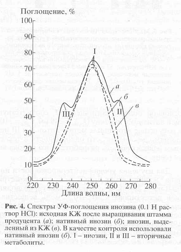 Применение сложных физико-химических методов для выделения биосинтетически 2Н-меченого инозина из КЖ диктовалось необходимостью получать инозин высокой степени хроматографической чистоты. Поскольку в КЖ наряду с синтезируемым продуктом присутствуют примеси неорганических солей, белков и полисахаридов, а также сопутствующие вторичные метаболиты нуклеиновой природы (аденозин, гуанозин) и непрореагировавшие субстраты (глюкоза, аминокислоты), проводили ступенчатое фракционирование КЖ. Повышенная чувствительность инозина к кислотам и щелочам и его нестабильность при выделении диктовали использование кислотных и щелочных растворов низкой концентрации, а также по-возможности проводить выделение при низких температурах, избегая длительного перегрева реакционной смеси. Фракционирование КЖ заключалось в низкотемпературном осаждении высокомолекулярных примесей органическими растворителями ацетоном и метанолом, твердофазной адсорбции/десорбции на поверхности активированного угля, экстрактивного извлечения продукта, перекристаллизации и ионообменной хроматографии. Белки и полисахариды удаляли низкотемператрным осаждением ацетоном при -40С, проводя последующую адсорбцию суммы рибонуклеозидов активированным углем на холоду. Десорбированные рибонуклеозиды извлекали из прореагировавшей твердой фазы элюцией этанольно-аммиачным раствором при 600С, а сам инозин экстракцией 0.3 М NH>4>-формиатным буфером (рН 8.9) с последующей перекристаллизацией в 80% этаноле. Окончательная стадия очистки заключалась в колоночной ионообменной хроматографии на катионообменнике AG50WX 4, уравновешенным 0.3 М NH>4>-формиатным буфером с 0.045 М NH>4>Cl с ТСХ контролем при R>f> 0.5. Данные по выделению инозина из КЖ штамма-продуцента представлены в виде спектров УФ-поглощения на рис. 4, а-в. Наличие в синтетическом образце (в) основной полосы поглощения , соответствующей нативному инозину (>max >249 нм, >249 >7100 М-1 см-1) и отсутствие вторичных метаболитов и неоспоримо доказывает его однородность и тем самым эффективность разработанного метода выделения со степенью хроматографической чистоты 92%.
