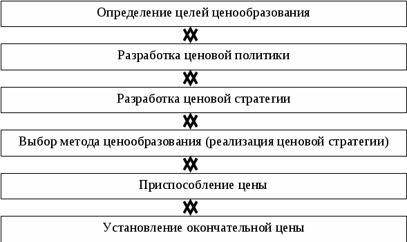Разработка ценовой стратегии-> Выбор метода ценообразия(реализация ценовой стратегии)-> Приспособление цены->Установление окончательной цены.