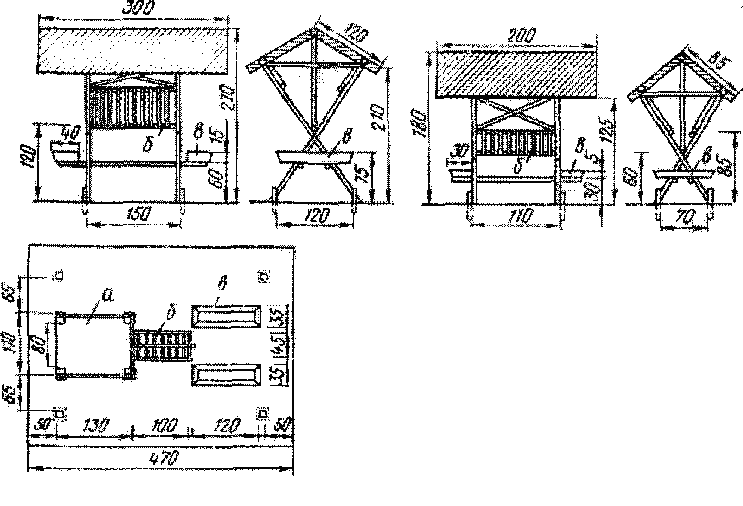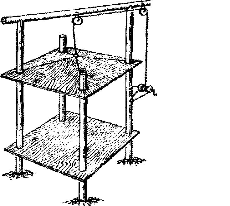 Для подкормки косуль веточным кормом и сеном ставят оборохи (рис. 3). Для этого четыре столба высотой 4—6 м закапывают в землю по углам квадрата 2X2 м. На вершины двух столбов кладут по диагонали горизонтально бревно с блоком посередине. Через этот блок перекидывают трос, а к его концу подвешивают четырехскатную крышу, которая может свободно подниматься и опускаться. Другой конец троса закрепляют на валу небольшого ворота. Над почвой па высоте 10 см внутри обороха делают деревянный помост. При заполнении обороха кормом крышку поднимают на блоке до верхнего предела. На помост доверху укладывают слоями лесное сено и сухие ветви. Корм пересыпают солью или обрызгивают рассолом. Когда оборох будет заполнен кормом, на него опускают крышу, которая его прессует. Олени берут корм со всех сторон. По мере уменьшения корма крыша опускается.