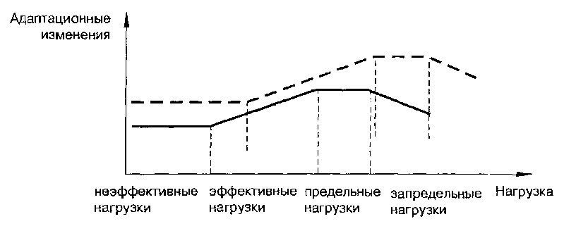 Как видно из рисунка, небольшие нагрузки, не достигающие порогового значения, прироста адаптации не дают. Такие нагрузки, обычно называемые неэффективными, приводят к появлению в организме лишь незначительных биохимических и физиологических сдвигов, следствием чего является отсутствие суперкомпенсации. Неэффективные нагрузки, хотя и не вызывают развития адаптации, способствуют сохранению достигнутого уровня физической подготовленности. Неэффективные нагрузки широко используются в оздоровительной физкультуре.