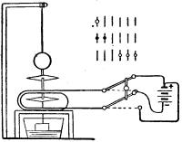 Действовал он следующим образом. Сигналы передавались при помощи шести мультипликаторов – шести пар магнитных стрелок, вращающихся в горизонтальной плоскости (рис. 1). В каждой паре одна стрелка вращалась внутри витков, а вторая – над витками проводника, по которому подавался сигнал. В верхней части подвесов были закреплены диски, одна сторона которых была белой, а другая – черной.