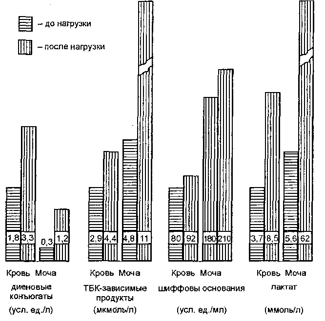 Исследования, выполненные на кафедре биохимии СПбГАФК им. П.Ф. Лесгафта, выявили четкую корреляцию между изменениями биохимических показателей крови и мочи, вызванными физической работой, причем в моче наблюдался более высокий рост этих показателей. В качестве примера на рис. приведены данные о влиянии велоэргометрической нагрузки в зоне большой мощности на показатели свободнорадикального окисления - диеновые конъюгаты, ТБК-зависимые продукты, шиффовы основания и уровень лактата крови и мочи.