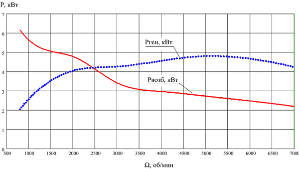 Рис. 13 Мощность возбуждения и выходная мощность генератора в зависимости от скорости.