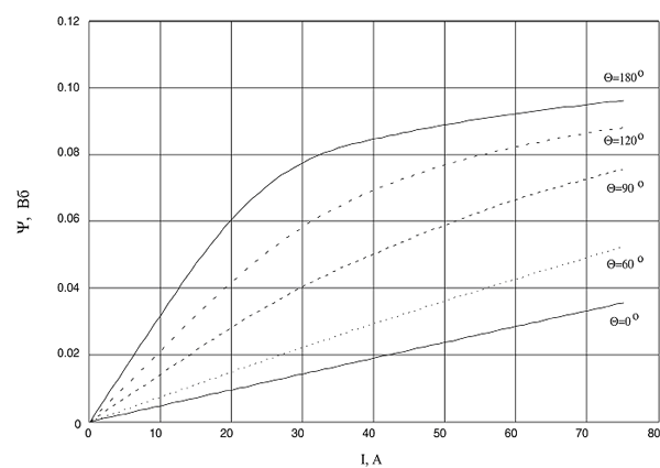 Рис.3 Зависимость потокосцепления катушки ИМ (18/12) от углового положения и тока.