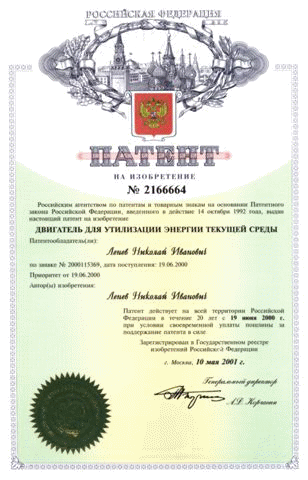 В Патенте предлагается оригинальный, ранее не использовавшийся ни в одной из существующих конструкций, способ использования энергии как водного потока любого вида (рек, ручьёв, приливов, морской волны и т.д.) так и движения воздушных масс. При этом используется естественный поток, без предварительного преобразования (строительства дамб, каналов, напорных труб).