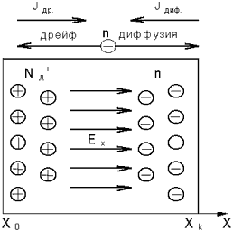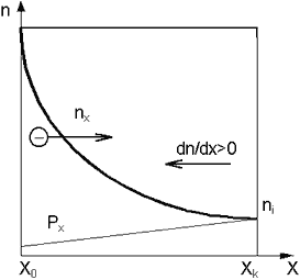 В некоторый условный начальный момент, когда закон распределения концентрации электронов совпадает с законом распределения донорной примеси (n=N>д>), кристалл в целом является электрически нейтральным и в каждом его элементарном объеме выполняется условие np=n>i>2, а вдоль оси X существует положительный градиент концентрации (см. рис.2) основных носителей – электронов dn/dx>0.