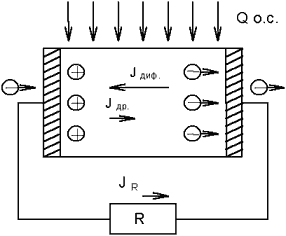 Если замкнуть разноименные концы полупроводникового кристалла металлическим проводником с сопротивлением R, то в цепи потечет электрический ток J>R>, и как следствие в кристалле нарушится электрическое и термодинамическое равновесие, а именно: электроны уйдут с правого конца кристалла и перейдут в левый конец кристалла через проводник, чем будет увеличен градиент концентрации электронов, а значит ток диффузии J>диф.>. увеличится, а ток дрейфа J>др.> уменьшится, так как уменьшится напряженность электрического поля E>х>.