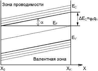 ΔE>с> – высота потенциального барьера между концами полупроводникового кристалла, φ>k> – разность потенциалов между концами полупроводникового кристалла, α – угол наклона энергетических зон.