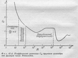 Качественной характеристикой, описывающей поток реальной жидкости, является сила, увлекающая цилиндр. На рисунке 3 графически изображена зависимость коэффициента увлечения С>d>, отношения силы к 1/2rV2Dl (D – диаметр, l – длина цилиндра, r - плотность жидкости).