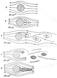 Когда число Рейнольдса проходит значение в районе 40, характер движения претерпевает неожиданное и резкое изменение. Один из вихрей за цилиндром становится настолько длинным, что отрывается и плывет вниз по течению вместе с жидкостью. При этом жидкость за цилиндром снова закручивается и возникает новый вихрь. Вихри отслаиваются то с одной, то с другой стороны и в какой-то момент вытягиваются вихревым следом за цилиндром. Такой поток вихрей называется цепочкой Кармана. Она всегда появляется для чисел Рейнольдса ?>40.