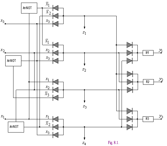 где каждое уравнение является ДНФ. Если задается вектор х, то вычисляется вектор у, т.е. функция, соответствующая системе ДНФ. Если же вектор у задается, а вектор х вычисляется, то схема АД вычисляет функцию, обратную системе ДНФ v обратную ДНФ.