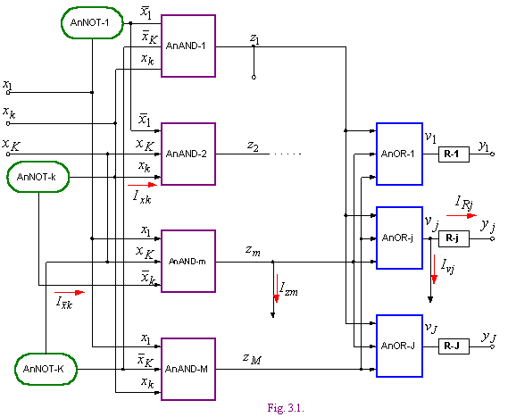 Рассмотрим теперь электрическую цепь, построенную из элементов ТД с единичным коэффициентом трансформации, AnAND, AnOR, AnNOT, резисторов и источников напряжения. Имея в виду, что элементы AnAND, AnOR, AnNOT, в свою очередь, содержат ТД с единичным коэффициентом трансформации, диоды, резисторы и источники напряжения, замечаем, что эта электрическая цепь содержит только ТД с единичным коэффициентом. Таким образом, эта цепь является частным случаем рассмотренной выше. В дальнейшем дальнейшем будет именовать схемой АД. Она изображена на фиг 3.1, где