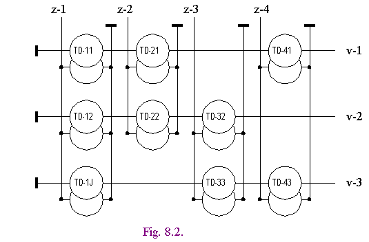 Точки x и y составляют два множества выводов схемы АД. Между точками z и v в схеме АД включена матрица трансформаторов ТД, изображенная на фиг 3.2. Из и этой схемы следует, что