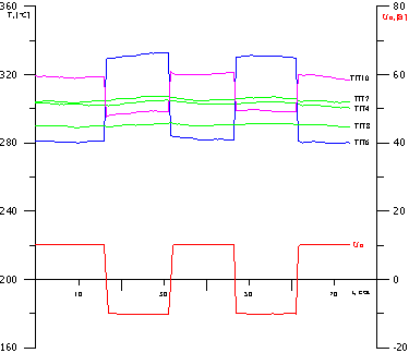 Показаны сигналы наиболее характерных термопар; там же показано переключаемое по знаку напряжение питания нагревательного элемента. Задачей описываемого опыта была оценка возможности использования в экспериментальных исследованиях термопар, имеющих непосредственный контакт с токонесущей поверхностью, поэтому не принимались специальные меры по уменьшению влияния естественного охлаждения, кроме теплоизоляции области установки термопар. Этим объясняется разброс по абсолютной величине сигналов термопар.