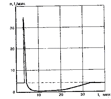 Рис. 3. Экспериментальная осредненная зависимость изменения числа n вспышек молнии в минуту от времени при использовании пяти ракет ?Облако¦ с ОДС.